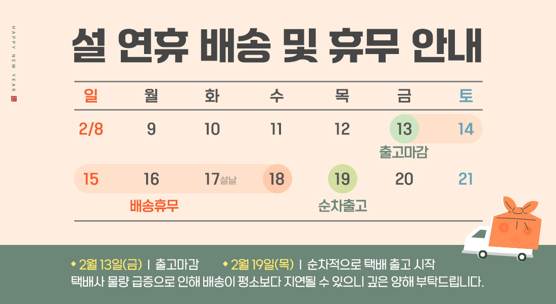 평일 오후 2시 이전 주문건 중 결제 완료된 건에 한해 당일 출고되며, 토/일요일 주문, 결제하셨을 경우